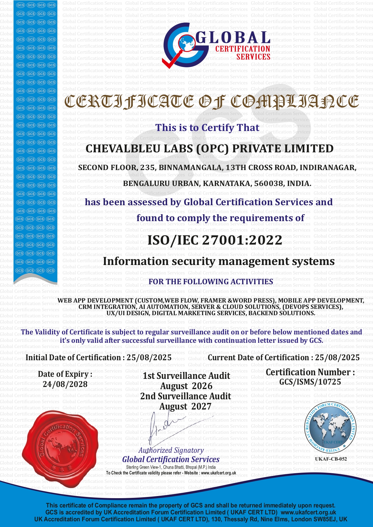 We are proud to be certified under ISO/IEC 27001:2022 by Global Certification Services (GCS), accredited by the UK Accreditation Forum Certification Limited (London). This milestone speaks for our dedication to maintaining the highest standards of security, compliance, and global excellence.