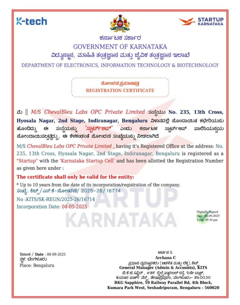 ChevalBleu Labs OPC Private Limited, the innovation partner of Webworks Co., is officially registered as a “Startup” with the Karnataka Startup Cell, Government of Karnataka, validating our compliance and commitment to entrepreneurial excellence.